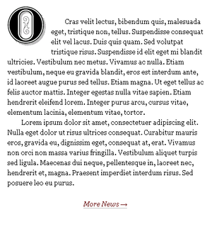 Rather than putting my versal image in the markup, I’m going to use an image replacement technique. Image replacement does exactly what it says: it replaces an element’s HTML text with an image. In this example, it will be accomplished by sucking the text out of the element with a negative text-indent