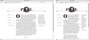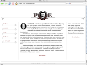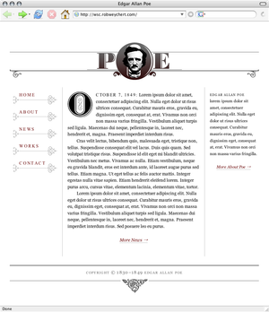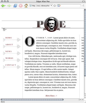 In order to demonstrate some possibilities, I’ve put together a little homepage for the original master of the macabre, Edgar Allan Poe (Figure 7-3). The basic layout is made up of four columns of approximately equal width. The two center columns compose the main content area, which is flanked by a navigation column on the left and a sidebar column on the right. The header and footer span the full width of the four columns.