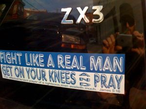 Fight Like a Real Man June 23, 2008 First posted on Flickr Check out the God rays! This bumper sticker is the word of the Lord.