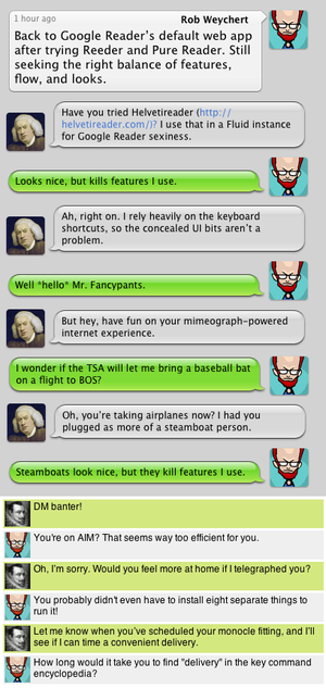 Back to Google Reader’s default web app after trying Reeder and Pure Reader. Still seeking the right balance of features, flow, and looks.