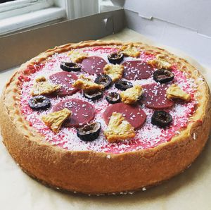 Pizza cake topped with coconut, figs, dried pineapple, and strawberry fruit leather. Made by the incomparable @chambermonster for @mattsutter’s 40th.