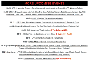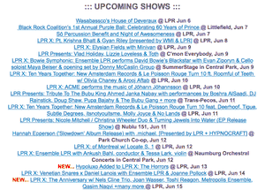 - Featured: upcoming shows of note, often arranged in a grid with large images of the artists for extra visual emphasis