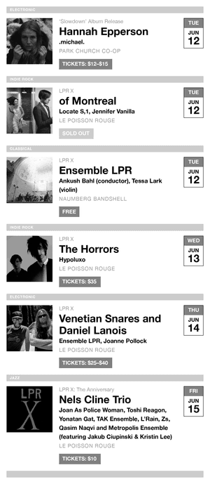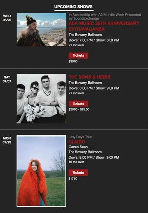 For one thing, these are all Bowery Ballroom shows, so the venue can be safely omitted from individual listings. For another, it’s commonly understood that the vast majority of shows take place at night, so the doors and show times can probably wait until the viewer clicks through to the event page.