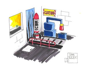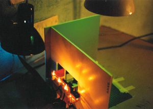 As the story came into focus, so did storyboards and set designs, and as with the previous films, shooting was an all-analog affair. Even the title sequences had to be printed on paper and animated in-camera. The university had a couple of camera rigs that shot frame-by-frame directly onto VHS. The system was intended for lo-fi pencil tests, so the quality wasn’t great, but a high quality system would probably have been wasted on someone like myself who had no idea what he was doing. I lit the film with strings of mini Christmas lights and desk lamps outfitted with colored party bulbs.