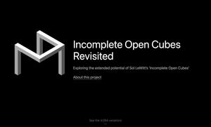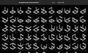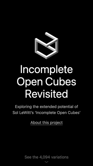 An open cube has 12 edges. How many variations are possible on an open cube with one or more edges missing? This was the animating question of Variations on Incomplete Open Cubes, a 1974 work by the acclaimed conceptual artist Sol LeWitt, which completely fascinated me when I discovered it. LeWitt found 122 variations, but as I studied them, I realized his definition of an incomplete open cube was more strict than my own, and I set out to expand upon the work. My version, Incomplete Open Cubes Revisited, found 4,094 variations. So began my journey into combinatorial algorithmic art, which eventually gave rise to Plus Equals.