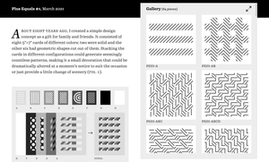 After dabbling sporadically in algorithmic art for a few years, I wanted to make a structured space for myself to explore it more regularly, so I created an art zine called Plus Equals. Published in print and online, Plus Equals is a semi-quarterly zine aiming to make algorithmic art and combinatorics as accessible as possible. Each issue develops a different visual system, finds every permutation of that idea, describes the philosophy and process, and displays the results, which may be as few as several dozen images or as many as several thousand.